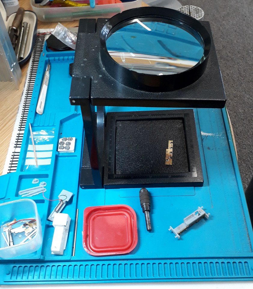 Tony was working on his conversion of a Farish Ivatt 2-6-0 using Nigel Hunt's upgrade etch for the valve gear and tender chassis. He was busily beavering away on the valve gear, in grave danger of a carelessly directed sneeze scattering his work far and wide...